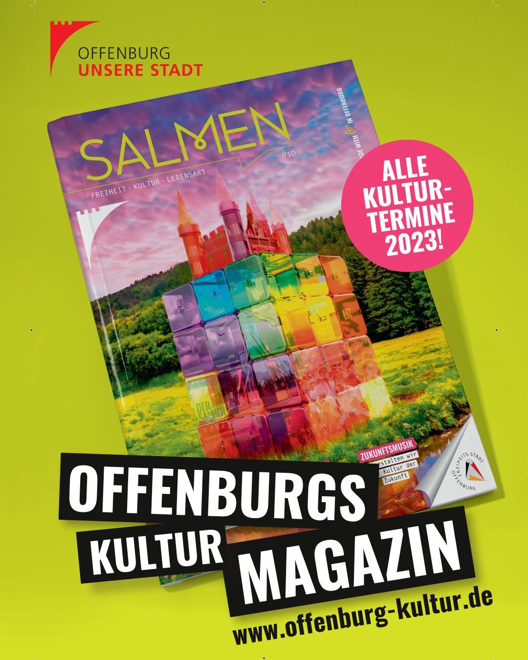 Salmen#10 betritt neues Terrain. Das futuristisch anmutende Cover-Motiv hat die Offenburger Künstlerin Linda Kunath-Ünver mithilfe einer künstlichen Intelligenz (KI) kreiert. Die fantastische, transparente Burg symbolisiert die Offenburger Kultur aus Sicht einer KI. Das passt zum aktuell angestoßenen Offenburger Kulturentwicklungsprozess, der im Heft anschaulich erklärt wird. Mit diesem Vorhaben möchte der Fachbereich Kultur die möglichen und nötigen Veränderungen der Offenburger Kulturlandschaft erfassen, analysieren und mit den unterschiedlichsten Akteuren gestalten.