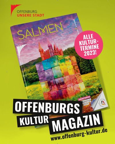 Zweimal im Jahr erscheint das Offenburger Kulturmagazin „Salmen“ und informiert über Aktuelles aus Kultur und Stadtgesellschaft. Das Magazin ist kostenlos an unterschiedlichen Auslagestellen in der Stadt verfügbar oder online abrufbar. Natürlich gibt’s das aktuelle Salmen-Magazin auch immer vor Ort im Salmen!